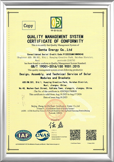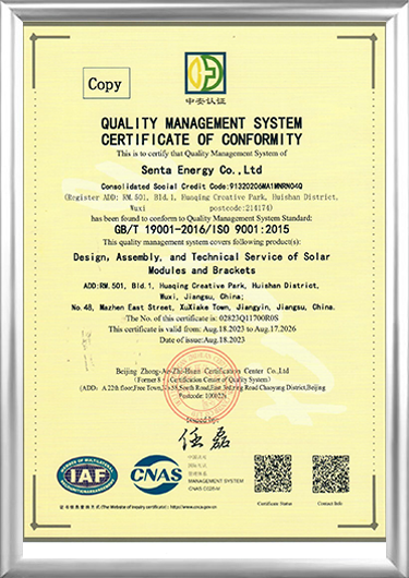 Fondată în 2016, Senta Energy Co., Ltd., cu sediul în Wuxi, Jiangsu, este o întreprindere de înaltă tehnologie, angajată în principal în domeniul generării de energie fotovoltaică și stocării energiei, al construcției de case prefabricate noi și al plantării agricole distribuite noi. Producători de componente pentru energie solară și Furnizori de componente solare. Integrând cercetarea și dezvoltarea independente, producția, vânzările și service-ul, ne angajăm să oferim utilizatorilor globali soluții complete pentru întregul ciclu de viață al energiei inteligente, clădirilor inteligente și plantelor inteligente.
